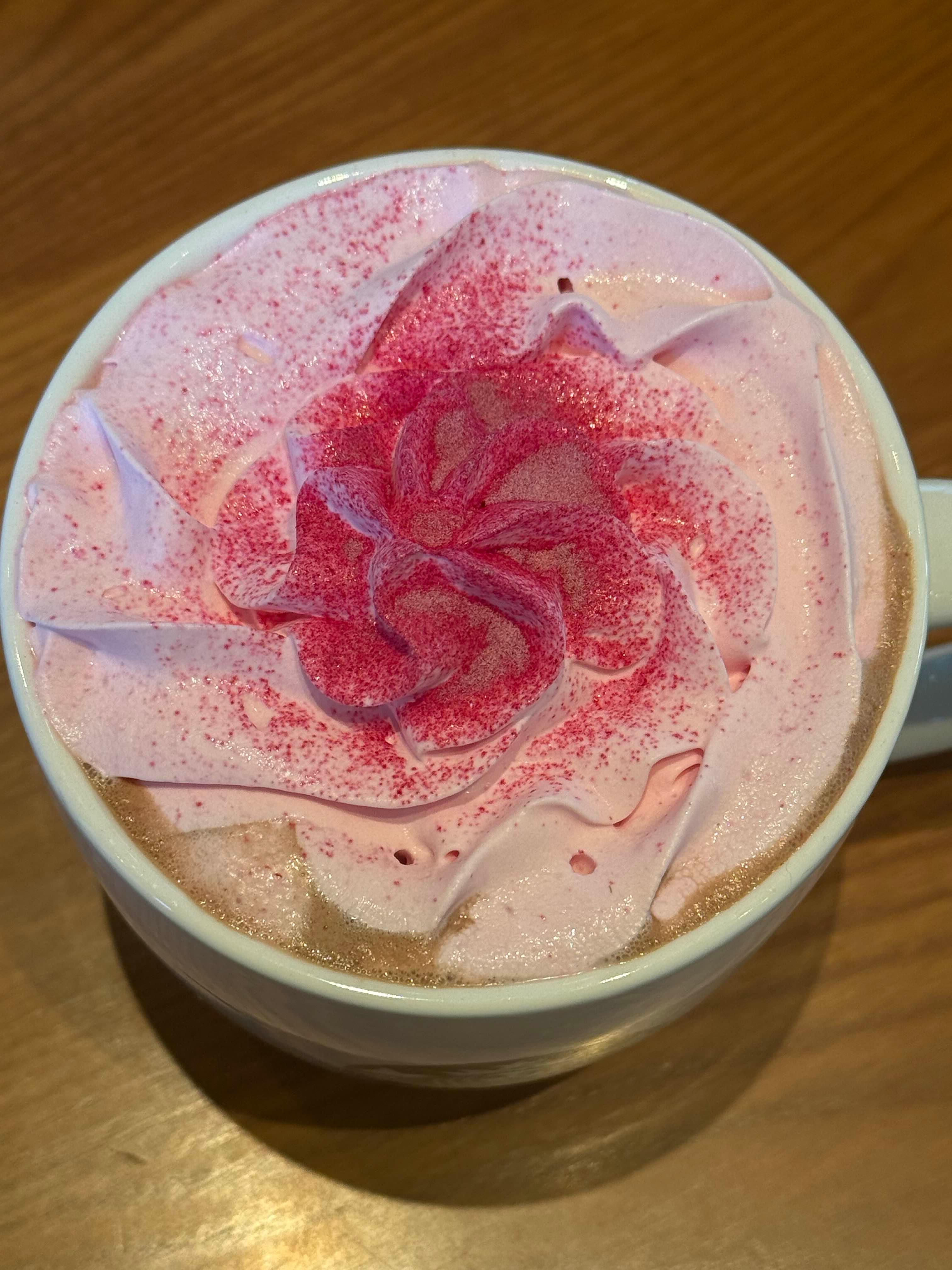 음료를 받는 순간 제일 먼저 느껴지는 건 비주얼의 압도감이었습니다. 진한 초콜릿 위에 핑크빛 로즈 파우더가 뿌려져 있어, 보기만 해도 기분이 좋아지고 ‘인증샷 욕구’를 확 당기더군요.